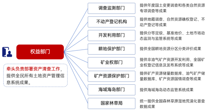 《工作方案》指出:本次資產(chǎn)清查基準時點為2023年12月31日。資產(chǎn)清查工作將按照“國家統(tǒng)一部署,省負總責,市縣抓落實”的模式開展,各省(區(qū)、市)也可結(jié)合資源稟賦、工作基礎(chǔ)、財力保障水平等,由省級統(tǒng)籌實施。資產(chǎn)清查工作由權(quán)益部門牽頭負責,調(diào)查監(jiān)測、不動產(chǎn)登記、開發(fā)利用、耕地保護、礦業(yè)權(quán)、礦產(chǎn)資源保護、海域海島和國家林草局等部門提供各類自然資源資產(chǎn)數(shù)據(jù)、系統(tǒng)成果。