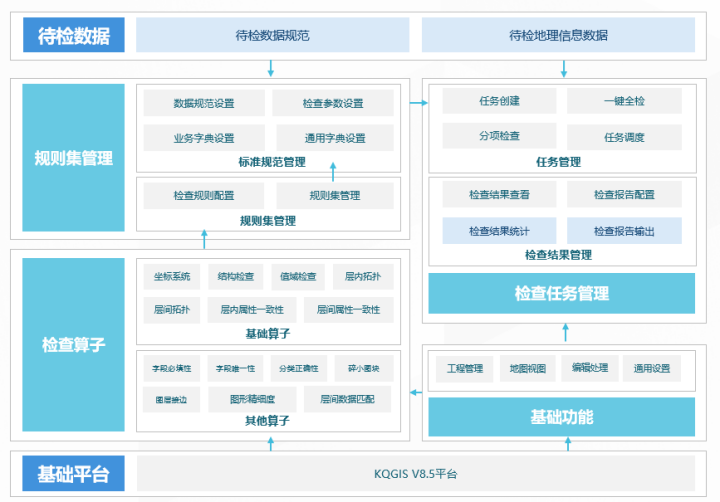 蒼穹地理信息數(shù)據(jù)質(zhì)量檢查系統(tǒng)基于KQGIS平臺(tái)自主研發(fā),旨在對(duì)各類(lèi)二三維地理信息數(shù)據(jù)進(jìn)行高效準(zhǔn)確的質(zhì)檢?;诓粩喔M(jìn)二調(diào)、三調(diào)和持續(xù)十多年的變更調(diào)查服務(wù),以及持續(xù)支撐國(guó)土空間規(guī)劃、實(shí)景三維等強(qiáng)GIS應(yīng)用,積累形成豐富的空間、屬性檢查算子,面向各類(lèi)地理信息數(shù)據(jù)規(guī)范化質(zhì)量檢查要求,實(shí)現(xiàn)基于算子的檢查規(guī)則靈活配置與規(guī)則集構(gòu)建管理,對(duì)二三維地理信息數(shù)據(jù)進(jìn)行高效檢查和結(jié)果輸出。