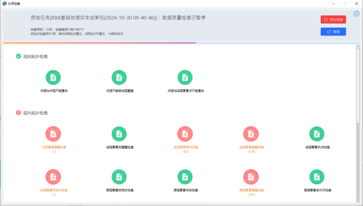 系統(tǒng)提供交互式質(zhì)檢能力,賦予用戶(hù)更加直觀、高效的質(zhì)檢體驗(yàn),支持對(duì)質(zhì)檢全過(guò)程的監(jiān)控與調(diào)度,允許用戶(hù)在質(zhì)檢進(jìn)行中隨時(shí)暫停或重啟,即時(shí)查看當(dāng)前的質(zhì)檢情況,確保隨控隨檢、無(wú)遺漏。同時(shí)采用圖屬聯(lián)動(dòng)的方式,對(duì)質(zhì)檢結(jié)果進(jìn)行可視化定位以及以質(zhì)檢報(bào)告形式導(dǎo)出,實(shí)現(xiàn)質(zhì)檢全流程數(shù)據(jù)的可回溯。