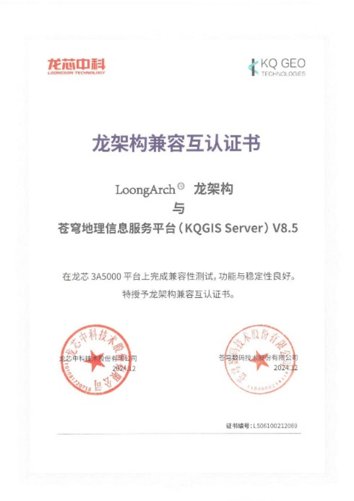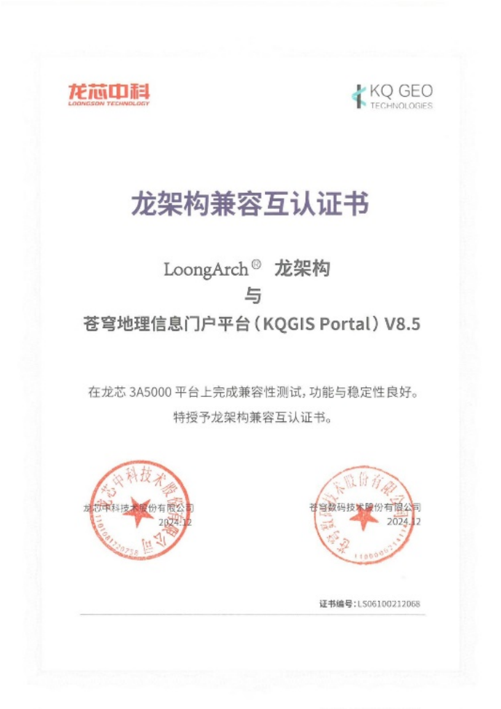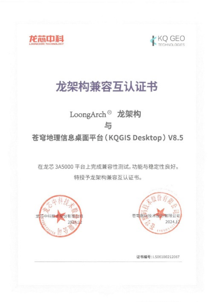 蒼穹數(shù)碼和龍芯中科的產(chǎn)品適配認(rèn)證,是雙方共同開展的一項覆蓋產(chǎn)品功能完整性、性能穩(wěn)定性以及安全性等多個關(guān)鍵維度的測試活動。經(jīng)過嚴(yán)謹(jǐn)和細(xì)致的測試,證明KQGIS在龍芯環(huán)境上運行流暢,性能卓越,能夠完全滿足用戶對于關(guān)鍵性應(yīng)用的高標(biāo)準(zhǔn)需求。本次適配認(rèn)證也意味著蒼穹數(shù)碼在國產(chǎn)環(huán)境廣泛兼容性上又得到了進(jìn)一步提升,能夠為用戶提供更加優(yōu)秀的GIS產(chǎn)品。