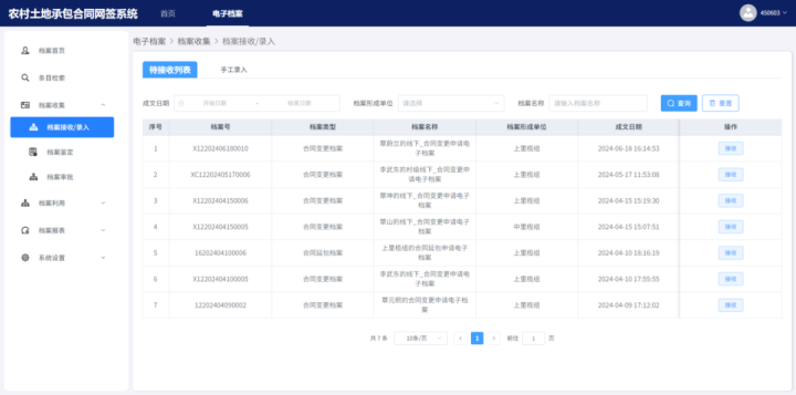 系統(tǒng)契合《第二輪土地承包到期后再延長30年試點(diǎn)工作檔案管理辦法》,能夠根據(jù)二輪延包農(nóng)戶自動(dòng)建立檔案文件目錄,無縫對接二輪延包業(yè)務(wù)審批系統(tǒng),自動(dòng)接收并檢查承包方延包申請、地塊調(diào)查信息、土地承包合同等關(guān)鍵信息。確保承包方農(nóng)戶“一戶一檔”,同時(shí)根據(jù)實(shí)際需要補(bǔ)錄線下檔案文件信息,保證檔案資料的完整性與準(zhǔn)確性。