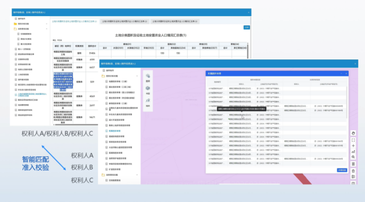 同時(shí)提供準(zhǔn)入一體化核驗(yàn)功能進(jìn)一步減少補(bǔ)正、退件問(wèn)題,通過(guò)構(gòu)建準(zhǔn)入審查分析規(guī)則,強(qiáng)化對(duì)報(bào)件數(shù)據(jù)格式規(guī)范、部用途管制監(jiān)管規(guī)范、省廳業(yè)務(wù)準(zhǔn)入規(guī)范、空間準(zhǔn)入規(guī)范四個(gè)層面的一體化核驗(yàn),保障所有業(yè)務(wù)要素、技術(shù)指標(biāo)嚴(yán)格契合部、省兩級(jí)審批標(biāo)準(zhǔn),有力確保部用途管制監(jiān)管通過(guò)率達(dá)到100%。為提升準(zhǔn)入核驗(yàn)的精準(zhǔn)度與智能化水平,引入DeepSeek大模型,借助其強(qiáng)大的知識(shí)圖譜構(gòu)建與語(yǔ)義理解分析能力,實(shí)現(xiàn)用地審批中被征(用)地單位權(quán)屬名稱與不動(dòng)產(chǎn)權(quán)利人名稱的智能比對(duì)核驗(yàn),規(guī)避因命名邏輯不一致而導(dǎo)致的準(zhǔn)入判斷錯(cuò)誤問(wèn)題。