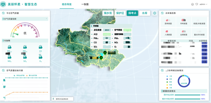 打開平臺的生態(tài)環(huán)境"一張圖",一幅會呼吸的數(shù)字畫卷徐徐展開。依托Unity3D技術(shù)構(gòu)建的全域三維沙盤,將鎮(zhèn)鄉(xiāng)街、保護(hù)區(qū)、國考點(diǎn)、水庫四大要素深度融合,山川走勢、水體脈絡(luò)、城鎮(zhèn)分布盡在指尖流轉(zhuǎn)。大氣與地表水實(shí)時數(shù)據(jù)在界面兩側(cè)動態(tài)呈現(xiàn),重點(diǎn)水體、噪聲動態(tài)分區(qū)、生物多樣性分布等核心要素?zé)o縫嵌入,織就"水源涵養(yǎng)—聲環(huán)境保護(hù)—物種棲息"的全域天網(wǎng)。從此,懷柔的每一寸生態(tài)家底,都在數(shù)字世界中清晰可觸。
