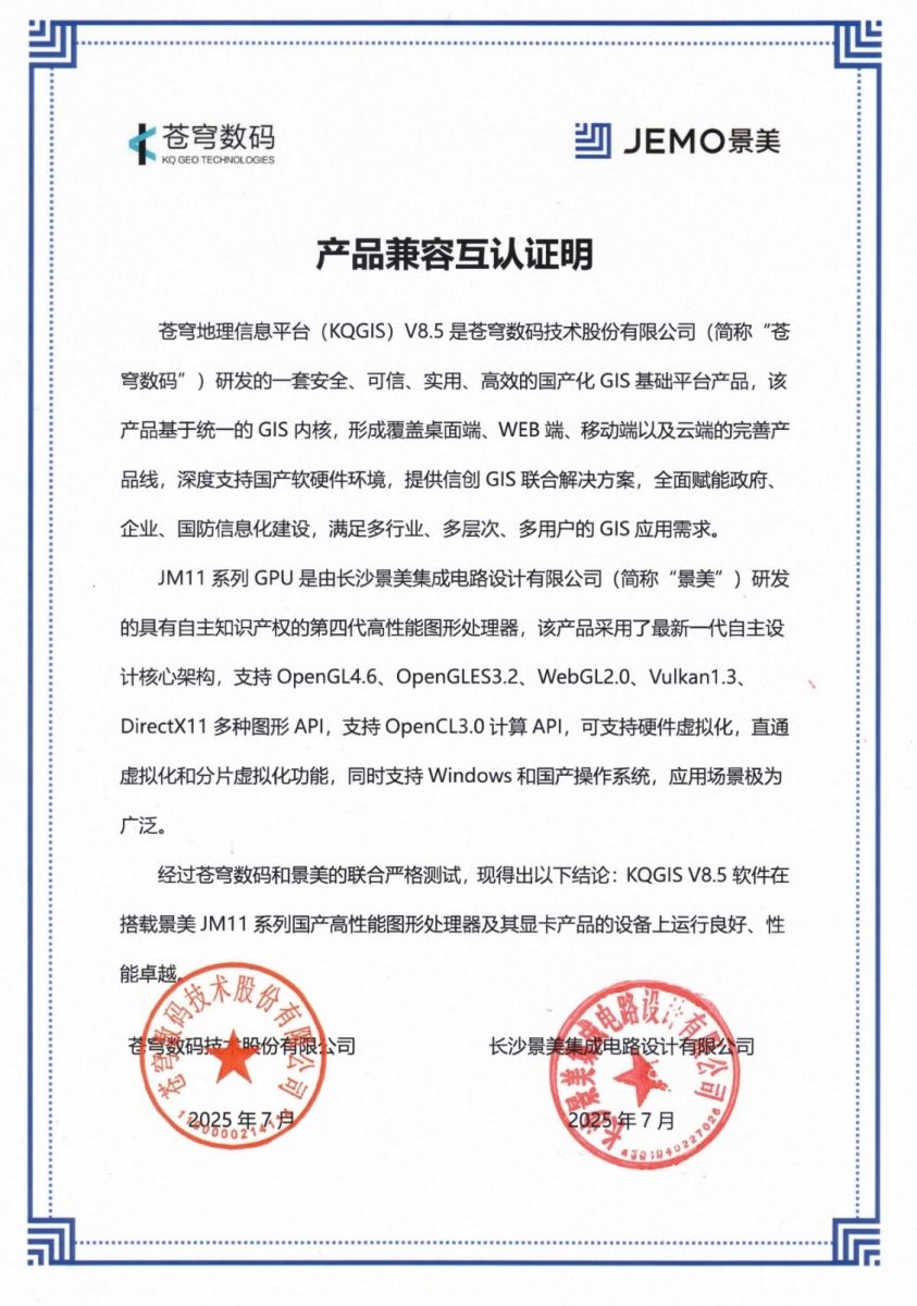 蒼穹數(shù)碼和景嘉微的合作一以貫之,早在2019年,雙方就共同完成了KQGIS和JM7200的適配,是當(dāng)時(shí)業(yè)內(nèi)首次實(shí)現(xiàn)國(guó)產(chǎn)GIS軟件和國(guó)產(chǎn)顯卡相互支持的創(chuàng)舉。2023年,雙方再接再厲,完成了KQGIS和JM920的適配,不僅進(jìn)一步提升了國(guó)產(chǎn)GIS在國(guó)產(chǎn)硬件設(shè)備上的性能,還為GIS的國(guó)產(chǎn)化替代提供更優(yōu)的解決方案。本次蒼穹數(shù)碼和景美的合作(景嘉微子公司),更是雙方深度合作的見(jiàn)證。KQGIS和JM11系列芯片的適配認(rèn)證,全面覆蓋產(chǎn)品功能完整性、性能穩(wěn)定性以及安全性等關(guān)鍵維度,以嚴(yán)謹(jǐn)細(xì)致的態(tài)度,對(duì)雙方產(chǎn)品進(jìn)行了一場(chǎng)全方位的“嚴(yán)格檢驗(yàn)”。