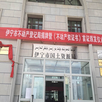 伊寧市不動(dòng)產(chǎn)登記中心正式揭牌,伊犁州國(guó)土資源局黨組副書記、局長(zhǎng)努爾別克·阿依甫,伊寧市副市長(zhǎng)、規(guī)劃局局長(zhǎng)賽爾江·哈力出席儀式,并向伊寧市村民麥麥提江·托合提頒發(fā)全疆第一本宅基地使用權(quán)及房屋所有權(quán)不動(dòng)產(chǎn)權(quán)證書,伊寧市不動(dòng)產(chǎn)登記中心正式受理不動(dòng)產(chǎn)登記業(yè)務(wù)。
