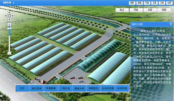 本系統(tǒng)采用了虛擬紋理、分塊調度等關鍵技術,解決了海量三維數(shù)據(jù)的建庫、管理、調度與發(fā)布問題,使得三維虛擬現(xiàn)實系統(tǒng)由單一的應用系統(tǒng)向系統(tǒng)集成方向發(fā)展成為可能。它能生動地從宏觀上展示農業(yè)園區(qū)的整體風貌,從微觀上描繪出大棚內各個設備的運行情況及數(shù)據(jù)參數(shù),使用戶直觀、生動并且快速的獲取到所需要的信息,將三維技術與農業(yè)信息化相結合,是蒼穹公司在現(xiàn)代農業(yè)領域的又一大創(chuàng)新。