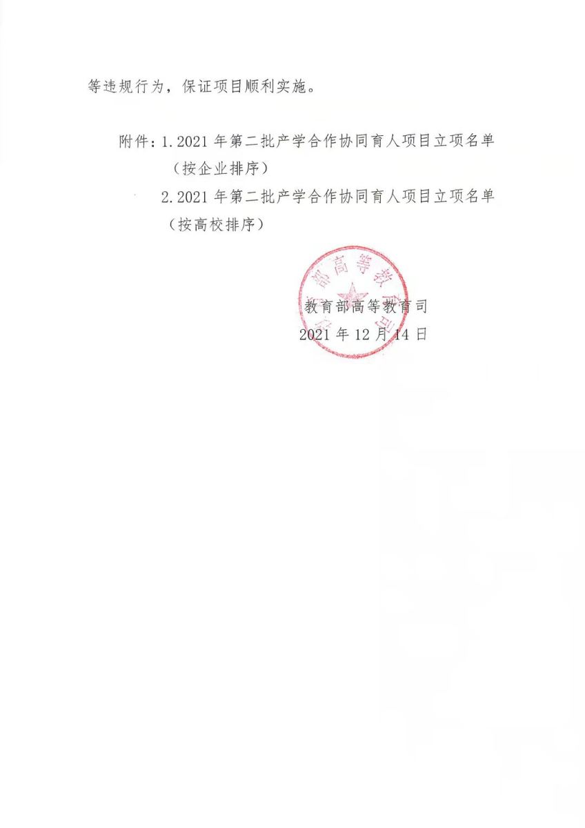12月14日,《教育部高等教育司關(guān)于公布2021年第二批產(chǎn)學(xué)合作協(xié)同育人項(xiàng)目立項(xiàng)名單的